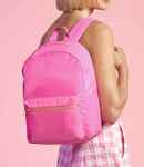 100% nylon. Recycled polyester lining. Premium fabric and finish. Grab handle. Padded adjustable shoulder straps. Padded back panel. Main zip compartment. Front zip pocket. Brushed gold metal zip and pulls. Tear out label. Capacity 10 litres.
