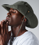 100% heavy washed cotton. Conforms to BS8466. Chin strap with leather toggle. Mesh eyelets. Press stud side turn-ups. Elasticated cord size adjuster with toggle. Offers protection against sunlight UPF50+.